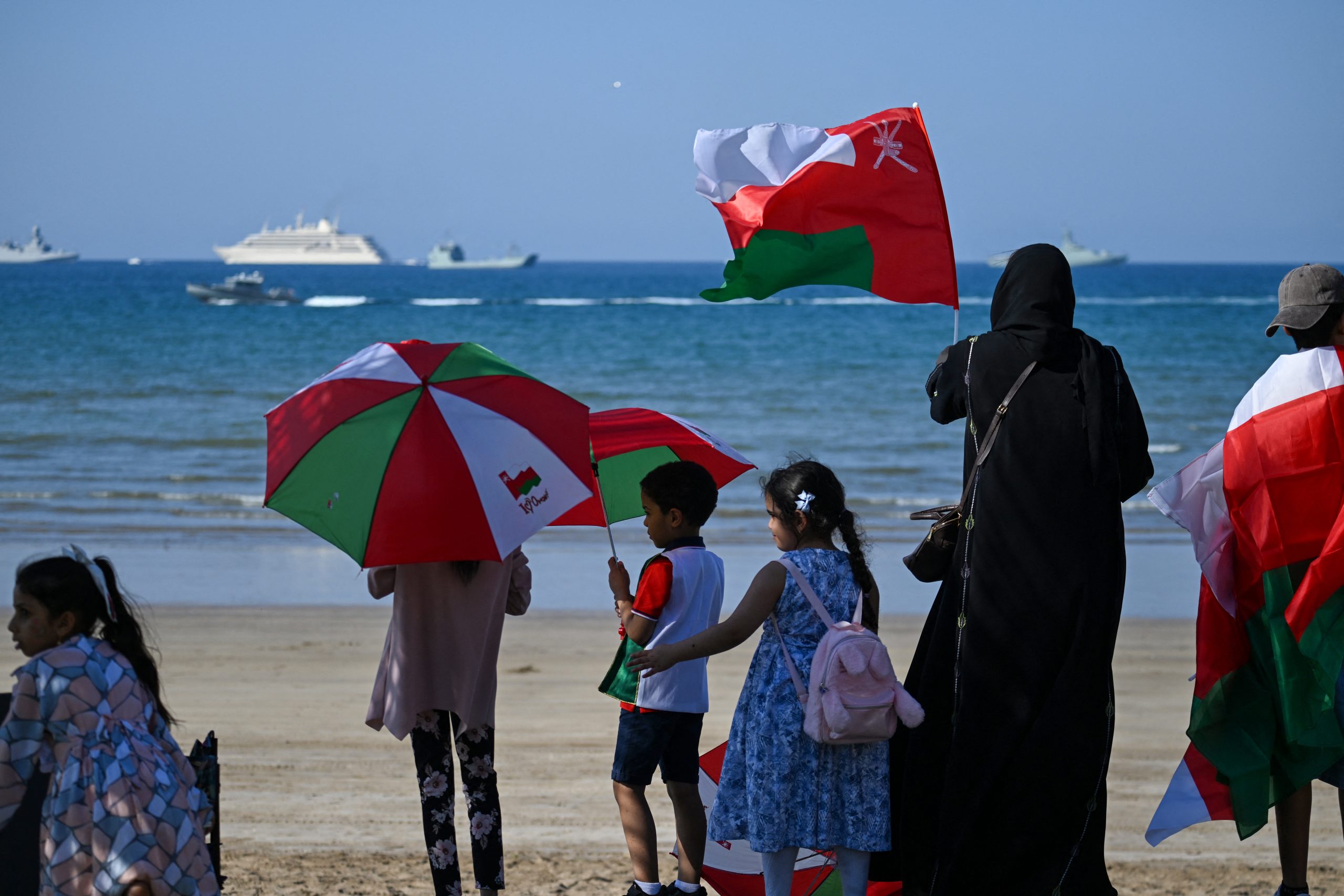 سكان العاصمة العُمانية مسقط يتابعون عرضاً بحرياً احتفالاً باليوم الوطني الـ 55 لسلطنة عُمان. يحتفل الناس من جميع الأعمار على ساحل العاصمة، حيث يلوحون بالأعلام ويتابعون المظاهر الاحتفالية. وعادة ما تكون التواريخ الوطنية أيام عطلات واحتفالات في الدول العربية.