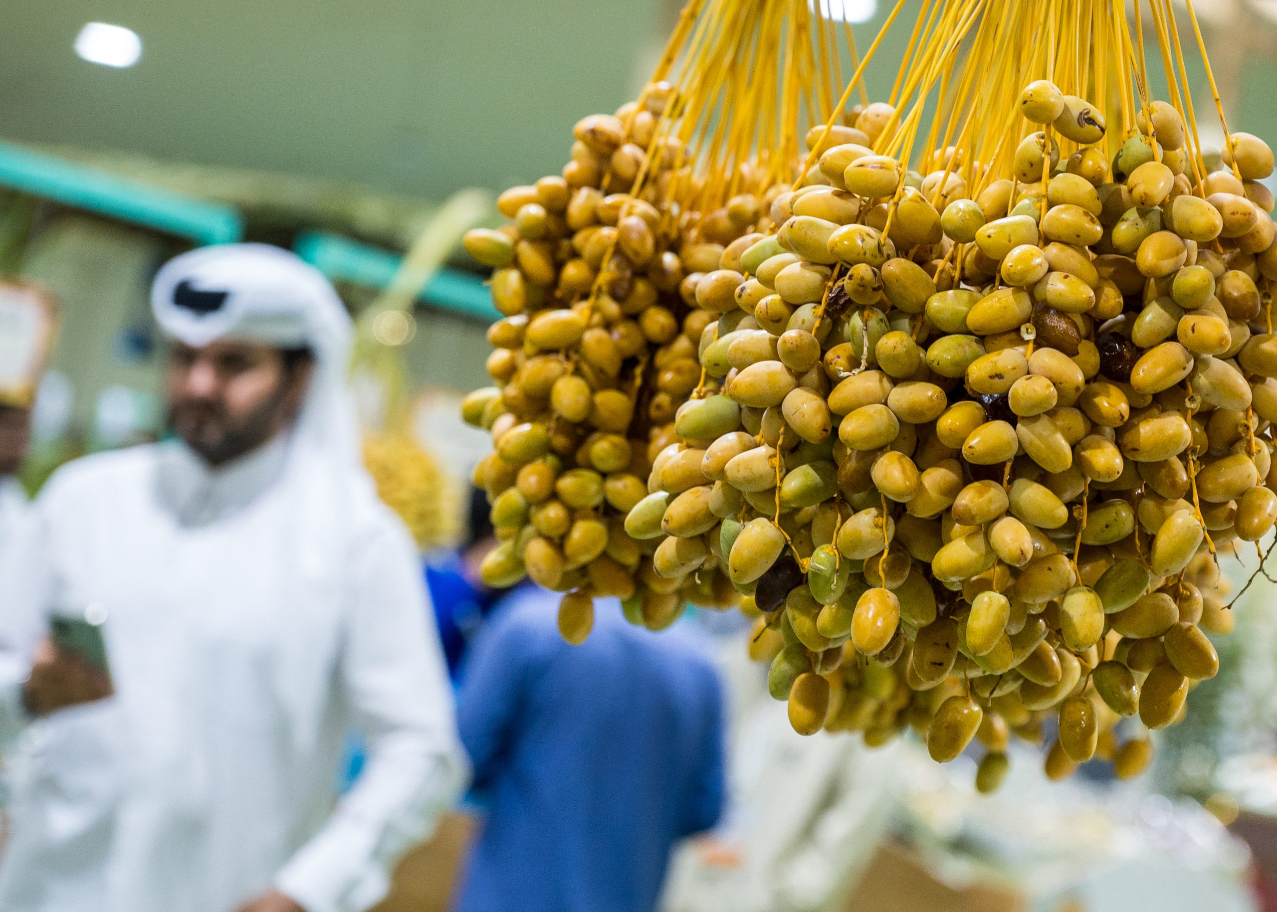 زوار مهرجان التمور المحلية في دورته العاشرة في سوق واقف التراثي في العاصمة القطرية الدوحة. حيث يشارك في هذا المهرجان أكثر من 100 من المنتجين من هذا البلد العربي ويعرض أنواعاً متنوعة من التمور والمنتجات، بالإضافة إلى الفواكه المزروعة محلياً.
