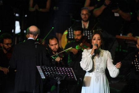 مشاركة المطربة التونسية محرزية الطويل الأسبوع الماضي مع الاوركسترا السيمفوني التونسي في افتتاح مهرجان قرطاج الدولي التاسع والخمسين في المدرج الروماني في قرطاج. ©Fethi Belaid/AFP