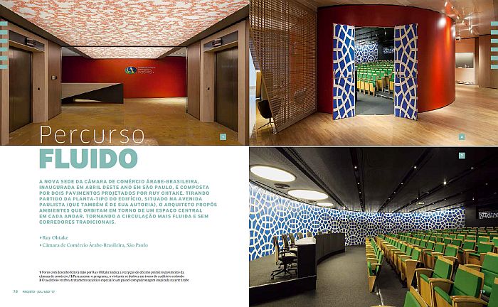 São Paulo – A nova sede da Câmara de Comércio Árabe Brasileira é capa do nº 438 da revista de arquitetura e design Projeto. A edição de julho e agosto da publicação traz reportagem com imagens e detalhes das instalações projetadas pelo arquiteto Ruy Ohtake, que foram inauguradas em abril deste ano na Avenida Paulista, em São Paulo.