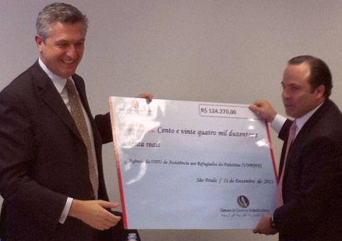 São Paulo – A campanha de doações à Agência das Nações Unidas de Assistência aos Refugiados Palestinos (Unrwa, na sigla em inglês) no Brasil, feita em parceria com a Câmara de Comércio Árabe Brasileira, arrecadou R$ 124.270 desde que foi lançada, em 30 de setembro, até a última segunda-feira (09). Na cerimônia de encerramento, realizada nesta quinta-feira (12) na sede da Câmara Árabe, em São Paulo, o comissário-geral da Unrwa, o italiano Filippo Grandi, recebeu um cheque simbólico do presidente da entidade, Marcelo Sallum, com o valor arrecadado.
