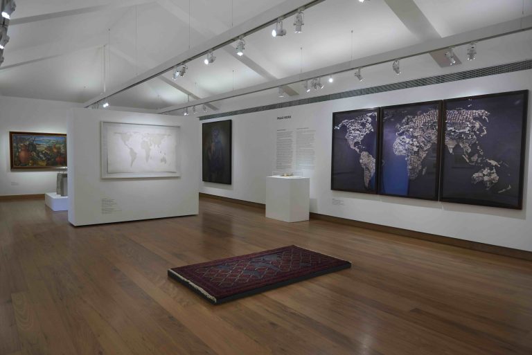 À ANBA, o diretor da Casa Roberto Marinho e coordenador geral da exposição, Lauro Cavalcanti, explica que a coleção de Vieira se destaca pelo recorte de mapas, cidades e paisagens urbanas. “Dentro dos trabalhos dele [da coleção de Vieira], estão dois belíssimos trabalhos da Mona Hatoum. Um sobre a base de tapetes que ela desgastou fazendo o mapa do mundo. E o outro também, de parede, que ela desgastou com papel cartão também fazendo um mapa. E esses dois trabalhos estão com muito destaque na exposição”, diz.