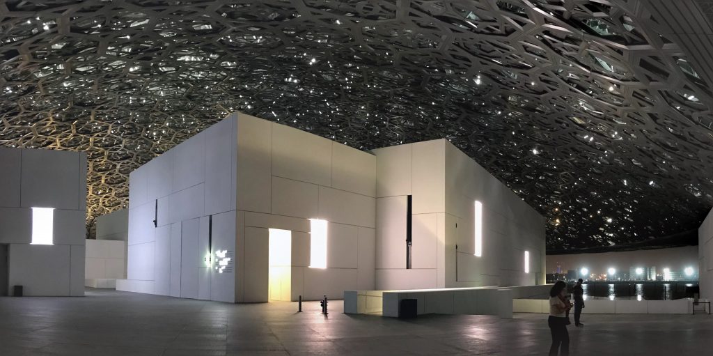 “It is a project founded on a major symbol of Arab architecture: the dome. But here, with its evident shift from tradition, the dome is a modern proposal,” explained the architect in the museum’s press material. During the day, the sunlight pierces through the dome’s layers to the galleries; at night, the museum’s lights come through the same spots, illuminating the Abu Dhabi night.