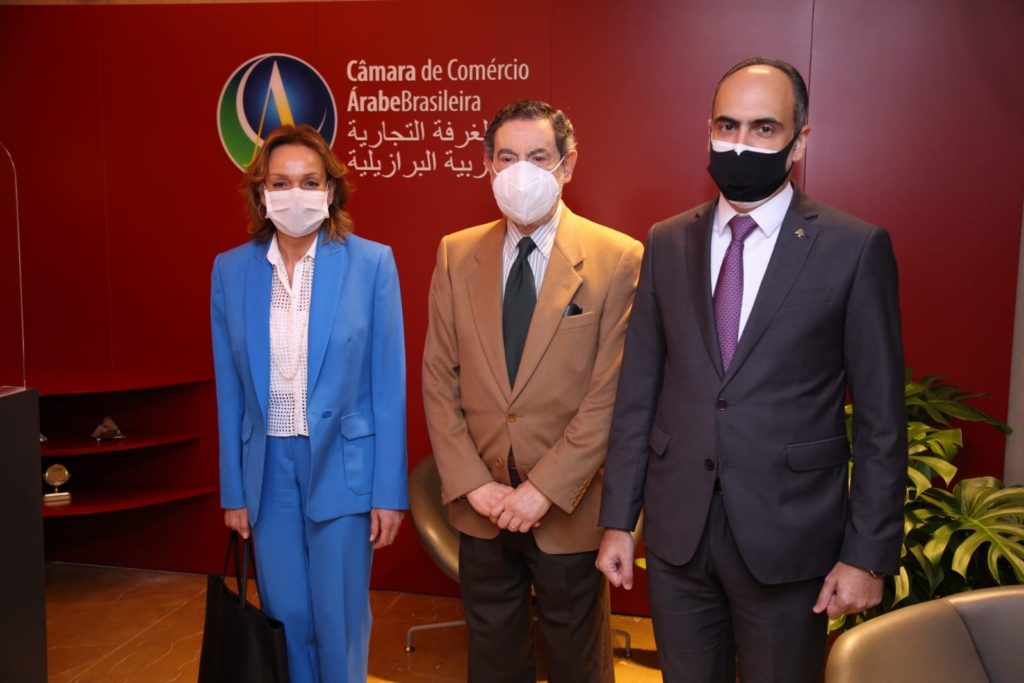 São Paulo – Following an event on Tuesday (6) when the idea of an investment fund to generate income for Lebanon was launched, ambassador Carla Jazzar, chargé d’affaires of the Embassy of Lebanon in Brasília, visited the headquarter of the Arab Brazilian Chamber of Commerce (ABCC) in São Paulo on Wednesday (7) with the commercial consul of Lebanon in São Paulo, Rudy El Azzi, to coordinate the next steps to help the Arab country get back on its feet and increase its sales to Brazil. The diplomats were welcomed by ABCC president Osmar Chohfi, secretary-general Tamer Mansour, Cultural director Silvia Antibas, and International Relations vice president Mohamad Mourad. Picture above, from left to right, Jazzar, Chohfi, and El Azzi.