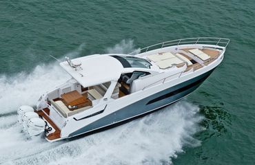 The boat features three outboard motors 350 horsepower each, which propel it to speeds higher than 40 knots (nearly 75 km/h). It features an open stern cockpit with coverage that enables sailing in any weather. The bow cockpit features two Italian leather-padded ergonomic seats. The yacht includes a bow lounge and a gourmet area on the stern. Inside, there’s a kitchen, a dining area, a bathroom and one cabin.