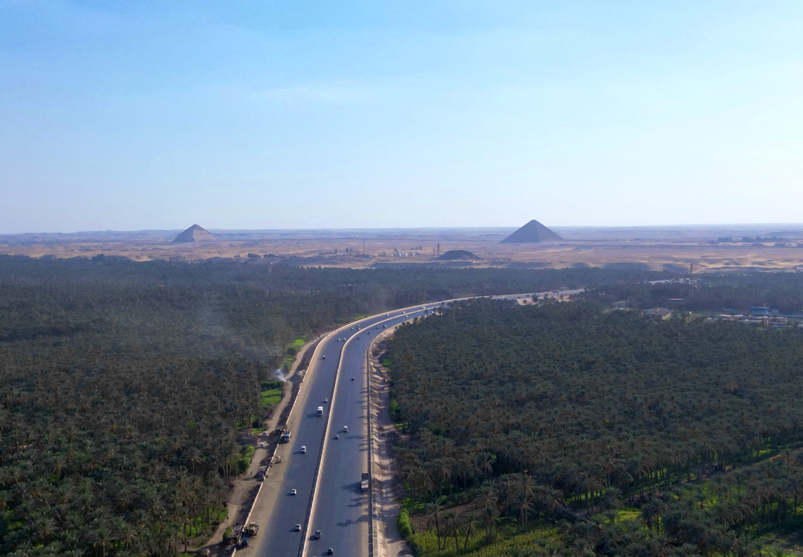An aerial view of the Bent Pyramid (L) and the Red Pyramid (R), with their approximately 4,600-year history at the Dahshur, built by Pharaoh Snefru. The Bent Pyramid, which has a different appearance due to the angle changes made during the construction process. The Red Pyramid got its name from the reddish limestone used in its construction.