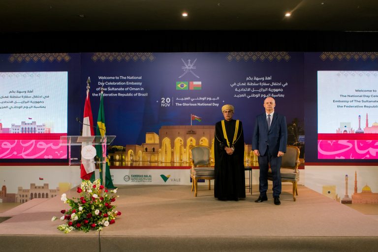 Oman National Day was celebrated in Brasília on Thursday (27) at an event hosted by the Embassy of Oman in Brazil. Ambassador Abdulghaffar Al Bulushi welcomed the guests, including Brazilian officials and diplomats. Clélio Nivaldo Crippa Filho, Director of the Middle East Department at Brazil’s Ministry of Foreign Affairs, attended the celebration. The Arab-Brazilian Chamber of Commerce (ABCC) was represented by its president, William Adib Dib Jr. In the photo above, Ambassador Al Bulushi (L) is pictured alongside Crippa Filho (R).