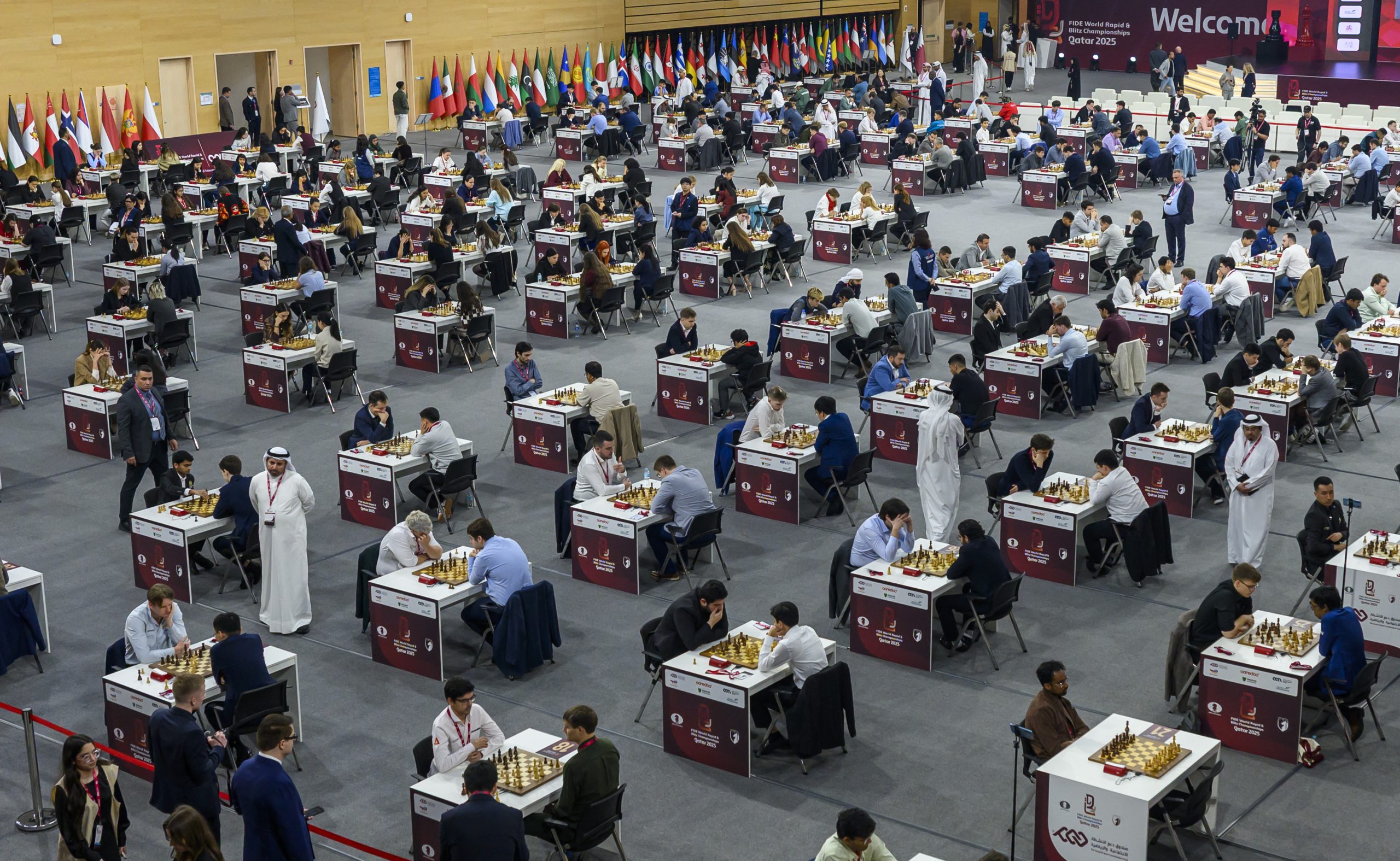 A general view shows the opening day and first round of the FIDE (International Chess Federation) World Rapid & Blitz Championships 2025 at Sports and Events Complex, Qatar University in Doha, Qatar, on December 26, 2025.