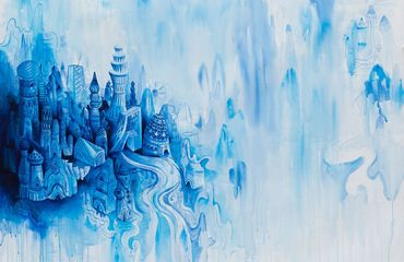 The gallery informs that Varela first started painting using ballpoint pen on rice paper, and the colour from this type of pen influences his work until this day. According to the gallery, Varela explores gradients from different shades of blue. Because the artist lives in Petrópolis, a city surrounded by mountains, the forest is a recurrent theme in his paintings. Cities are another staple of his pieces.