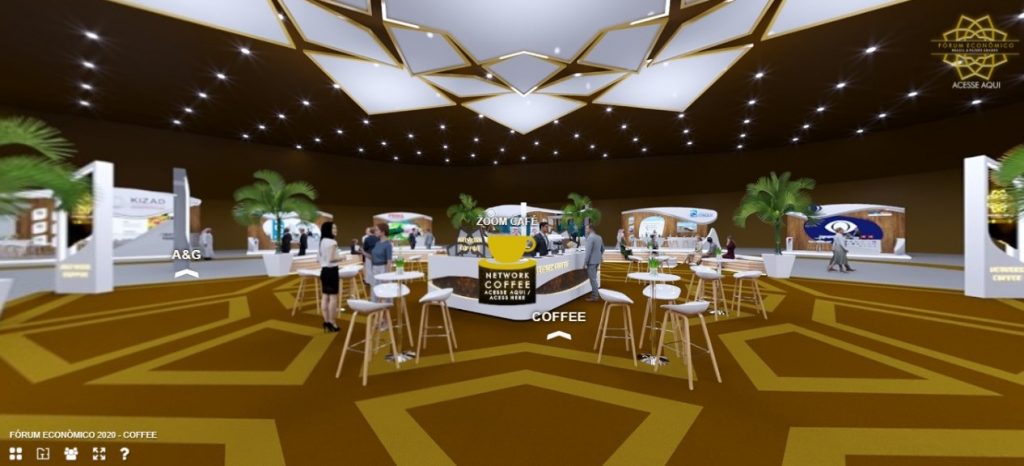São Paulo – Brazilian and Arab companies that are participating in the exhibition area of the Economic Forum Brazil & Arab Countries have a series of technologic features at their disposal to attract new contacts. For many companies, this is their first experience exhibiting at an online platform, which will be available until October 22. Pictured above, the Networking Coffee area, where you can access a Zoom meeting to strike new connections and ask questions.