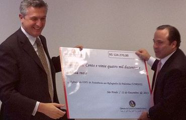 São Paulo – The donation campaign to the United Nations Relief and Works Agency for Palestine Refugees in the Near East (Unrwa) in Brazil, held in partnership with the Arab Brazilian Chamber of Commerce, raised R$ 124,270 (US$ 53,506) from its launch on September 30th until last Monday (9th). At the campaign’s closing ceremony, held this Thursday (12th) at the Arab Brazilian Chamber headquarters, in São Paulo, Chamber president Marcelo Sallum presented the Unrwa commissioner general, Italy’s Filippo Grandi, with a symbolic cheque for the sum raised.