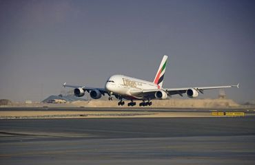 The A380 can carry 853 passengers, but the units flown by Emirates are configured to seat 489 and 517 people in three classes: first, business and economy. It has two decks, 15,200 km flight range, 72.7 meters of length and a wingspan of 79.8 meters.