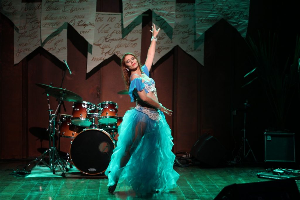 The show choreographer is the very dancer to step on the stage: Izabell Lins (pictured above), a benchmark in Arab dance in Piauí. The accordion is played by the conductor of the Orquestra Safônica de Teresina, Ivan Silva. The repertoire is composed of songs from Piauí but gained new arrangements to bring the Arab sound. The band features derbake, an Arab percussion instrument.