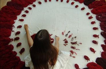 The symbol of her work is a red heart made of thread, so she decided to take 100 such hearts from Brazil to Jordan. In Jordan, she produced another 100 hearts using local materials. To this end, Adrianna went to the city of Jerash and purchased red- dyed lamb wool. History has it that local tribes used to wander through the desert and make carpets out of lamb wool.