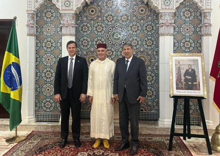 The Embassy of Morocco in Brazil’s federal capital Brasília celebrated on Wednesday (30) the 26th Anniversary of King Mohammed VI’s accession to the throne in Morocco. Morocco’s ambassador to Brazil, Nabil Adghoghi (center in the photo), welcomed the Arab Brazilian Chamber of Commerce’s International Relations vice president and secretary general, Mohamad Mourad (left), and the