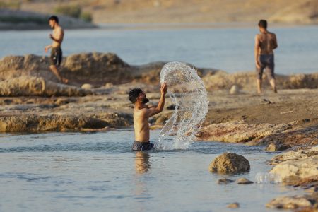 A man splashes water into the air while standing in the Great River in Jhamaka village, Erbil, Iraq last weekend. The riverbanks serve as both a playing field and a cooling spot for residents during the summer heat, according to ©Agence France Presse (AFP). ©Sabur Rashid/Middle East Images/AFP