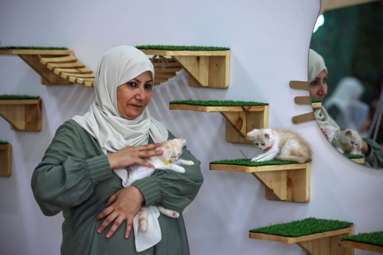 Gaza – Um café para gatos abriu esta semana em Gaza com a ideia de oferecer uma trégua aos palestinos que residem neste território sob bloqueio israelense. No Meow Cat Cafe, sua dona, Nehma Maabad (foto acima), acaba de preparar comida para uma multidão de gatinhos.