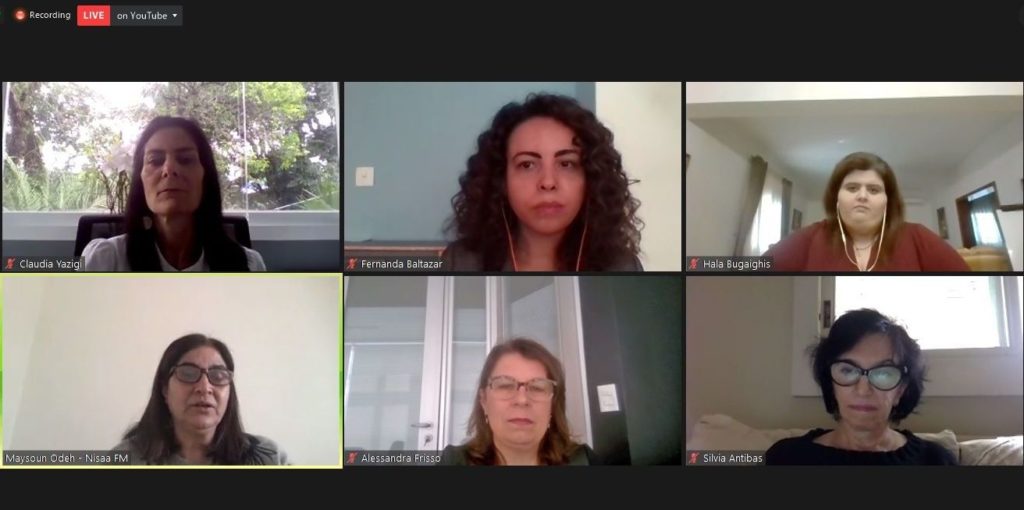 A palestina Maysoun Odeh Gangat, que criou uma estação de rádio voltada para mulheres em Ramallah, foi a outra árabe convidada especial do webinar. Ela também percebeu grande impacto da pandemia na vida das mulheres do seu país, maior do que na dos homens. “Muitos empregos foram perdidos e as mulheres foram vítimas nesse sentido”, afirmou, lembrando a jornada dupla em casa e no emprego das que conseguiram segurar as suas vagas.