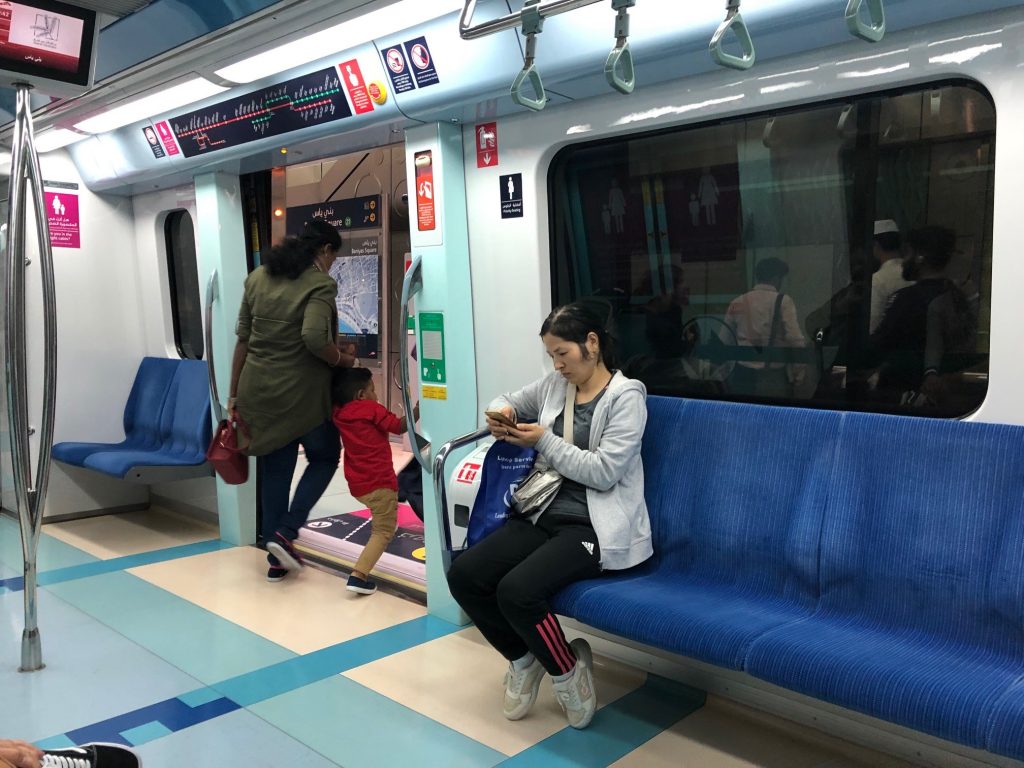 Os trens, assim como a cidade, são muito limpos e seguros, além de pouquíssimo ruidosos, e no vagão destinado às mulheres era possível observar gente de todos os cantos do mundo, turistas e trabalhadoras, oriente e ocidente, de short ou de véu, conversando e enviando mensagens de texto em inúmeros idiomas. Todas num mesmo lugar, filipinas, indianas, francesas, inglesas, chinesas, americanas, brasileiras – ali, éramos todas iguais.