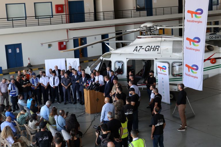 Beirute – A empresa francesa TotalEnergies anunciou nesta quarta-feira (16) que uma plataforma chegou em águas libanesas para a exploração de reservas de gás offshore, meses após um acordo histórico que demarcou a fronteira marítima entre Líbano e Israel. Na foto acima, cerimônia de inauguração em Beirute para receber helicópteros que operarão na plataforma de exploração de gás.