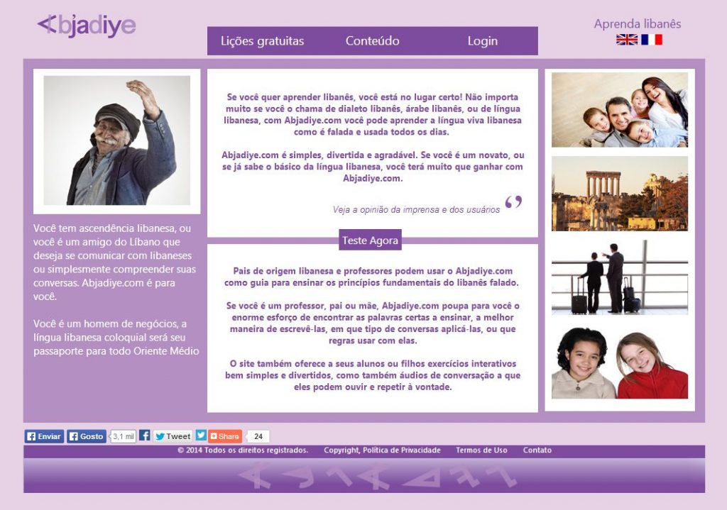 A versão nacional do site levou cerca de cinco meses para ficar pronta e foi concluída no segundo semestre do ano passado. O Abjadiye conta com 99 lições, divididas em três módulos. Neles, o aluno aprende como se apresentar, falar de comida, fazer compras, falar de nacionalidades, além de lidar com situações como ir ao banco, à farmácia ou ao consultório médico, entre outras.