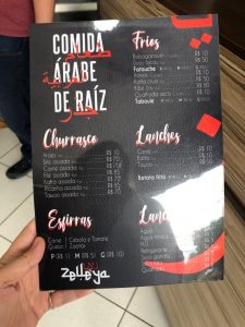 Em seis pessoas, comemos kafta, churrasco de carne e frango, esfihas de queijo, zaatar e carne, um sanduíche de carne típico, tomates e cebolas assados na churrasqueira, saladas tabule e fatouch, hommus, pão árabe e batata frita, algumas das opções de almoço no restaurante. A conta deu R$ 205, R$ 41 por pessoa por um verdadeiro banquete halal, com bebidas – água e refrigerante – e coalhada. Um ótimo custo-benefício.